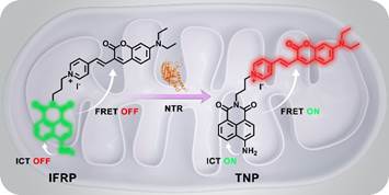 1 比率型荧光探针IFRP对神经元线粒体内NTR的响应原理示意图。